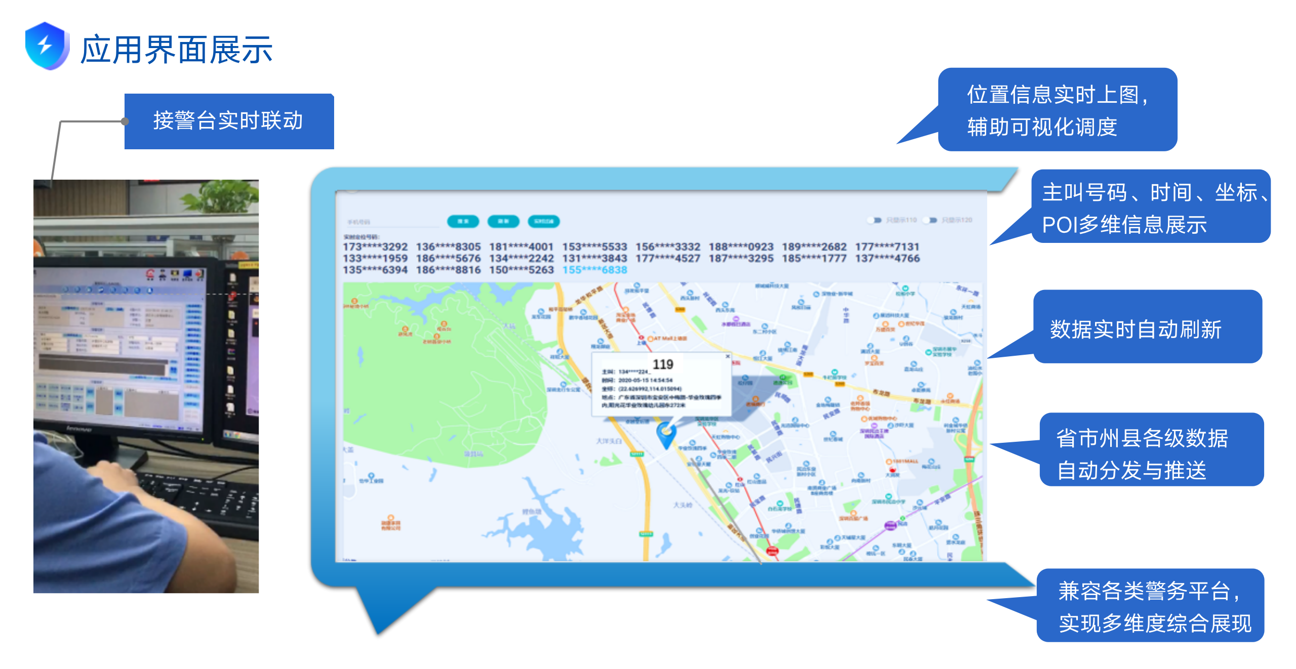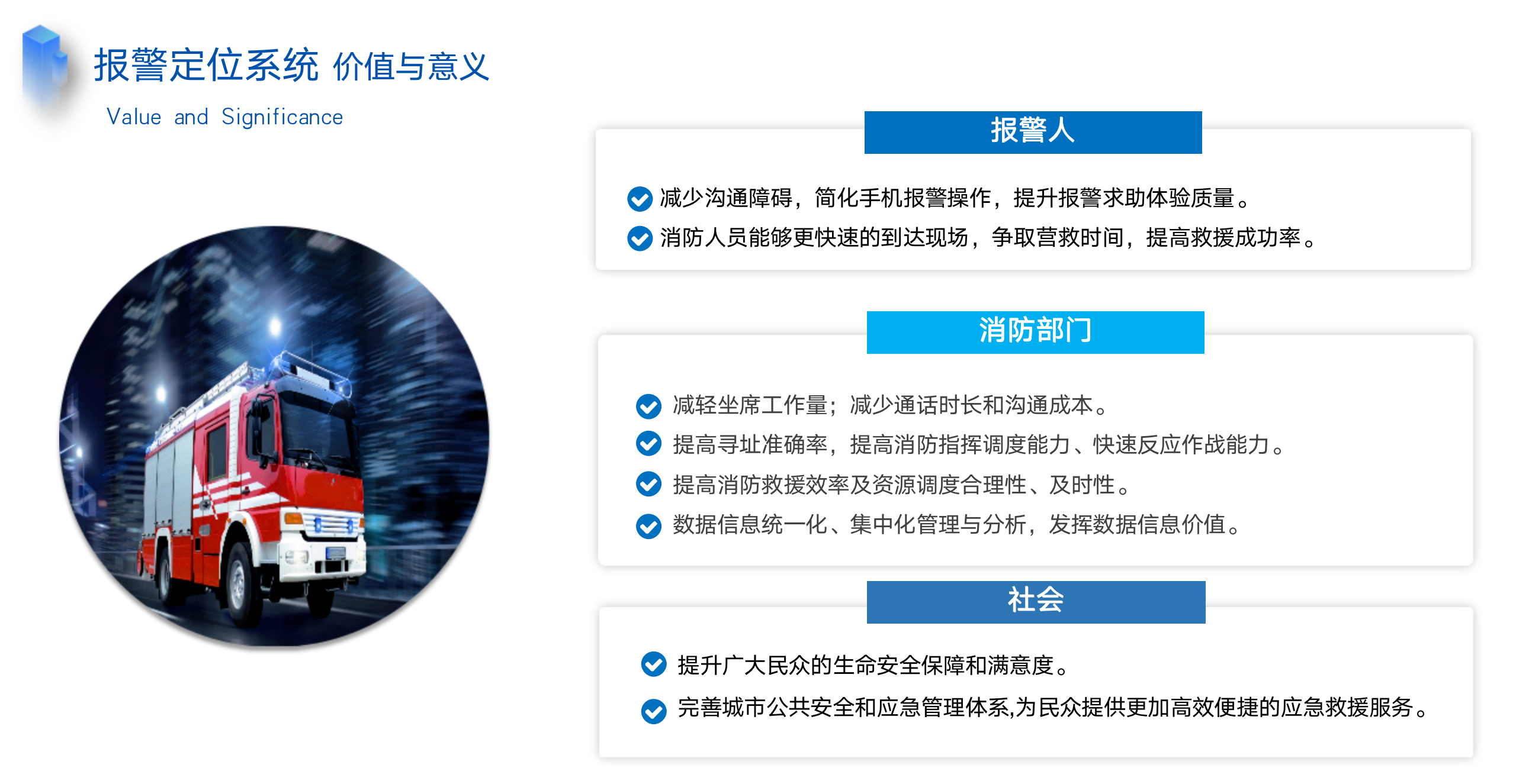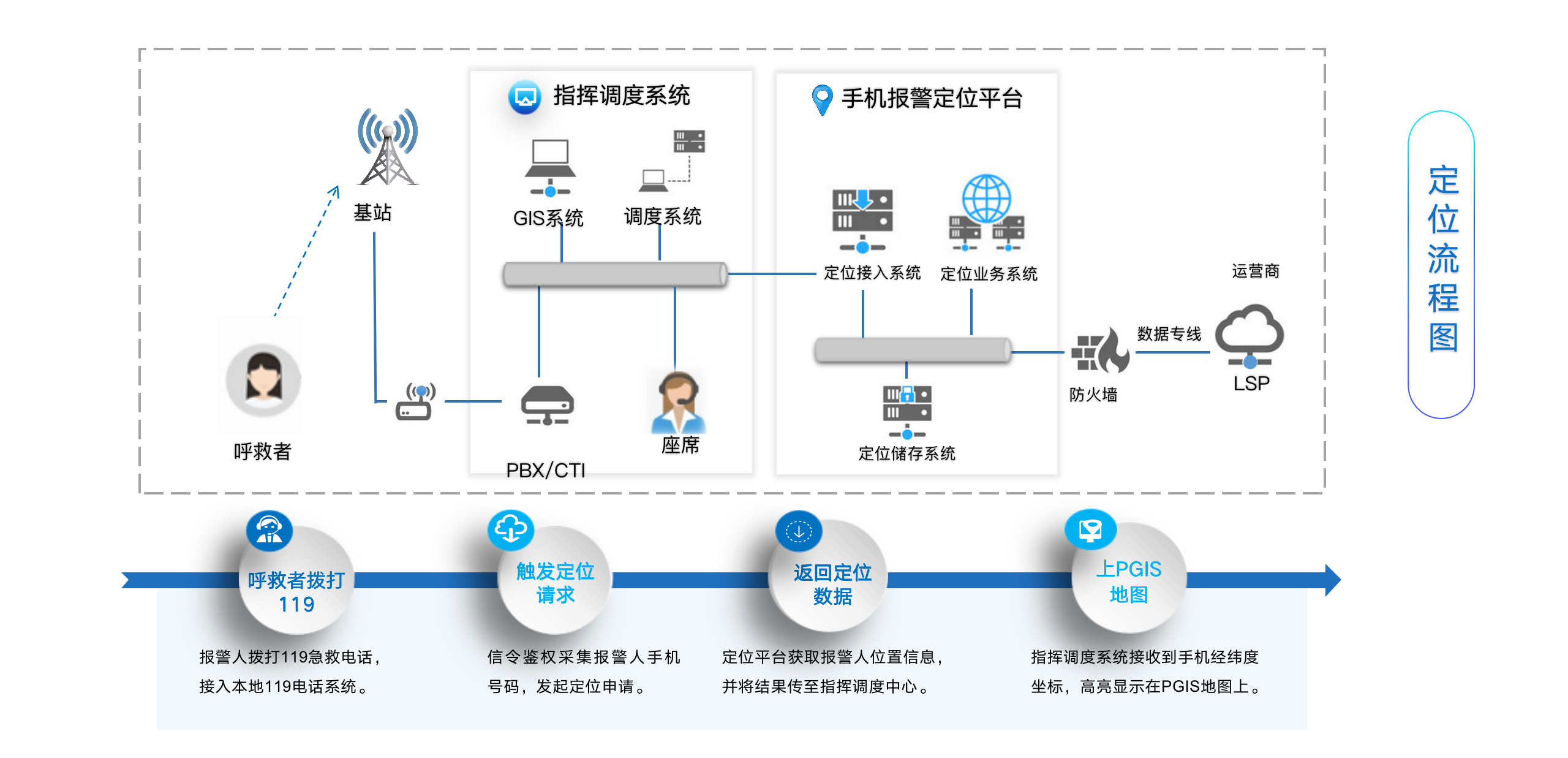 以运营商基站和通信核心网为依托,一方面与各类接处警系统接入服务连接并实现通信,另一方面与三大运营商的定位接入网关统一对接,实现与运营商定位服务器间的通信和定位功能, 打通三大运营商不同的语音信令,LSP,鉴权等平台构架与业务和数据流程 国产传媒在线,简化各省市消防机关分别与三大运营商或互联网应用提供商进行定位能力申请和对接的过程,切实提高平台搭建效率,保证大范围,短时间投入实际生产环境, 提供高精度定位能力,GIS解析等升级调用能力,不断升级迭代面向5G网络的精准定位能力。